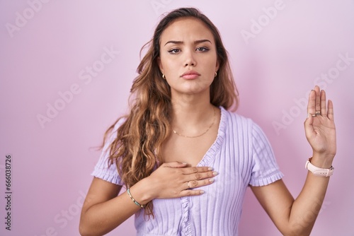 Young hispanic woman standing over pink background swearing with hand on chest and open palm, making a loyalty promise oath
