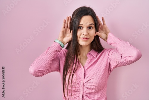 Young hispanic woman standing over pink background trying to hear both hands on ear gesture, curious for gossip. hearing problem, deaf