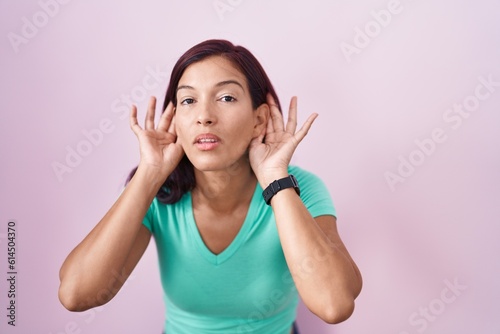 Young hispanic woman standing over pink background trying to hear both hands on ear gesture, curious for gossip. hearing problem, deaf