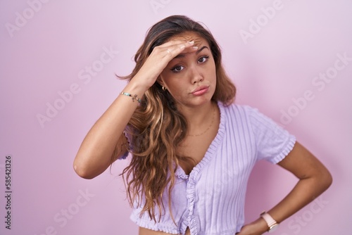 Young hispanic woman standing over pink background worried and stressed about a problem with hand on forehead, nervous and anxious for crisis