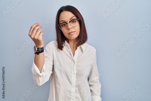 Young hispanic woman standing over white background doing italian gesture with hand and fingers confident expression