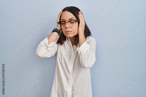 Young hispanic woman standing over white background suffering from headache desperate and stressed because pain and migraine. hands on head.