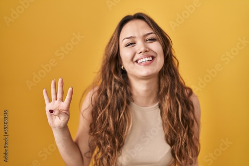 Young hispanic woman standing over yellow background showing and pointing up with fingers number four while smiling confident and happy.