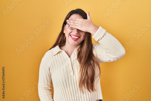Young hispanic woman standing over yellow background smiling and laughing with hand on face covering eyes for surprise. blind concept.