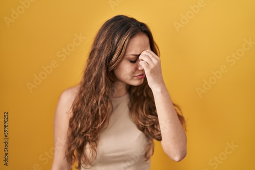 Young hispanic woman standing over yellow background tired rubbing nose and eyes feeling fatigue and headache. stress and frustration concept.