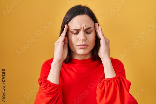 Young hispanic woman standing over yellow background with hand on head for pain in head because stress. suffering migraine.