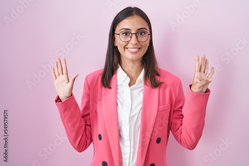 Young hispanic woman wearing business clothes and glasses showing and pointing up with fingers number nine while smiling confident and happy.