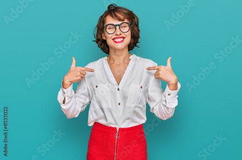 Young hispanic woman wearing business style and glasses looking confident with smile on face, pointing oneself with fingers proud and happy.