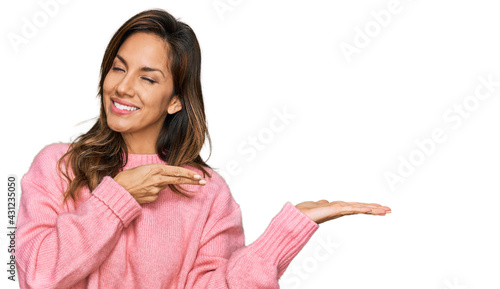 Young hispanic woman wearing casual clothes amazed and smiling to the camera while presenting with hand and pointing with finger.