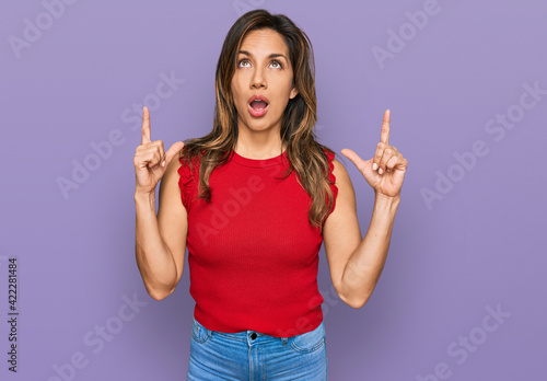 Young hispanic woman wearing casual clothes amazed and surprised looking up and pointing with fingers and raised arms.
