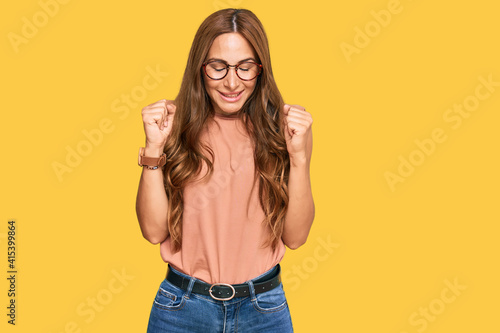 Young hispanic woman wearing casual clothes and glasses excited for success with arms raised and eyes closed celebrating victory smiling. winner concept.