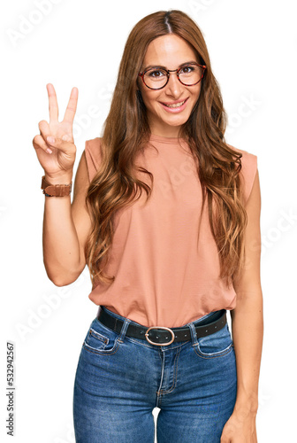 Young hispanic woman wearing casual clothes and glasses showing and pointing up with fingers number two while smiling confident and happy.