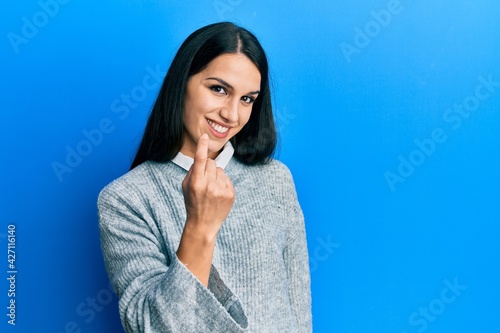 Young hispanic woman wearing casual clothes beckoning come here gesture with hand inviting welcoming happy and smiling