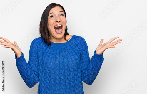 Young hispanic woman wearing casual clothes celebrating crazy and amazed for success with arms raised and open eyes screaming excited. winner concept