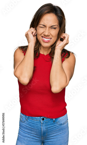 Young hispanic woman wearing casual clothes covering ears with fingers with annoyed expression for the noise of loud music. deaf concept.