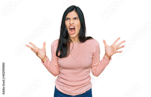 Young hispanic woman wearing casual clothes crazy and mad shouting and yelling with aggressive expression and arms raised. frustration concept.