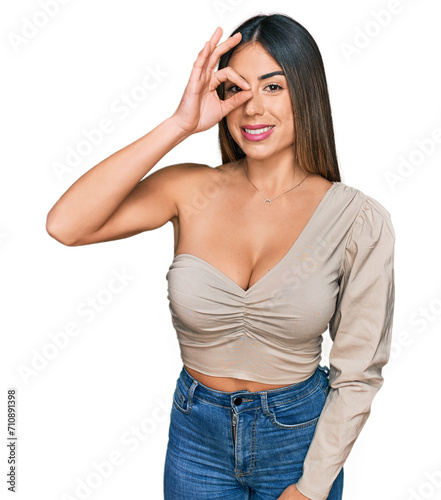 Young hispanic woman wearing casual clothes doing ok gesture with hand smiling, eye looking through fingers with happy face.