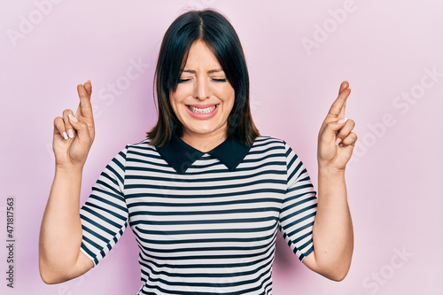 Young hispanic woman wearing casual clothes gesturing finger crossed smiling with hope and eyes closed. luck and superstitious concept.