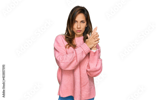 Young hispanic woman wearing casual clothes holding symbolic gun with hand gesture, playing killing shooting weapons, angry face