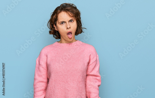 Young hispanic woman wearing casual clothes in shock face, looking skeptical and sarcastic, surprised with open mouth