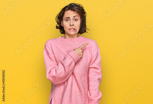 Young hispanic woman wearing casual clothes pointing aside worried and nervous with forefinger, concerned and surprised expression