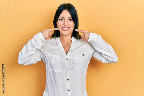 Young hispanic woman wearing casual clothes smiling cheerful showing and pointing with fingers teeth and mouth. dental health concept.
