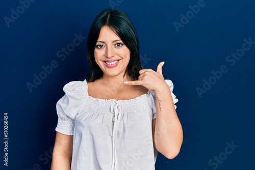 Young hispanic woman wearing casual clothes smiling doing phone gesture with hand and fingers like talking on the telephone. communicating concepts.