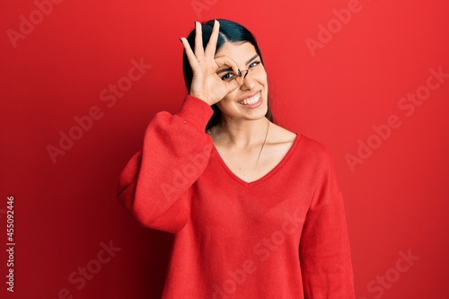 Young hispanic woman wearing casual clothes smiling happy doing ok sign with hand on eye looking through fingers