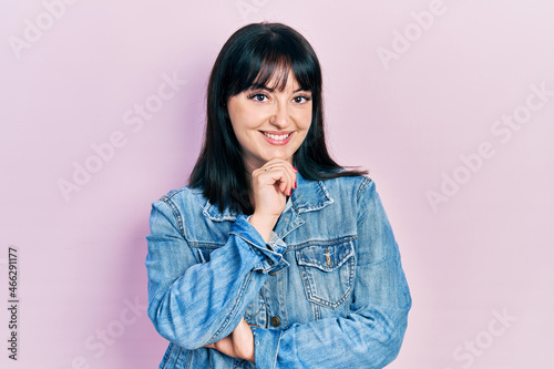 Young hispanic woman wearing casual clothes smiling looking confident at the camera with crossed arms and hand on chin. thinking positive.