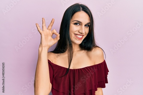 Young hispanic woman wearing casual clothes smiling positive doing ok sign with hand and fingers. successful expression.