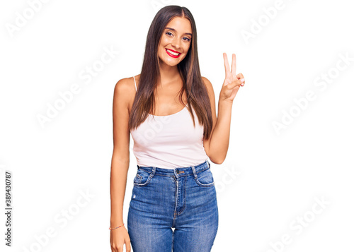 Young hispanic woman wearing casual clothes smiling with happy face winking at the camera doing victory sign. number two.