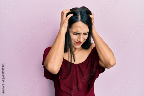 Young hispanic woman wearing casual clothes suffering from headache desperate and stressed because pain and migraine. hands on head.