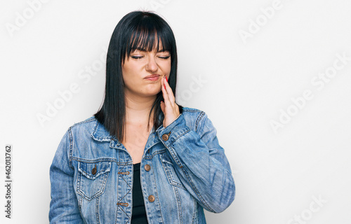 Young hispanic woman wearing casual clothes touching mouth with hand with painful expression because of toothache or dental illness on teeth. dentist