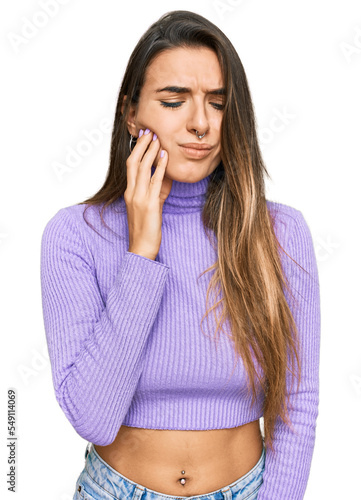 Young hispanic woman wearing casual clothes touching mouth with hand with painful expression because of toothache or dental illness on teeth. dentist