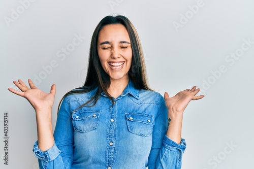 Young hispanic woman wearing casual denim jacket celebrating mad and crazy for success with arms raised and closed eyes screaming excited. winner concept