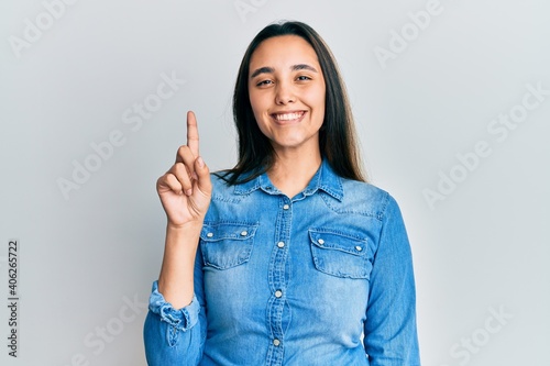 Young hispanic woman wearing casual denim jacket showing and pointing up with finger number one while smiling confident and happy.
