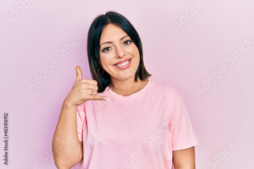 Young hispanic woman wearing casual pink t shirt smiling doing phone gesture with hand and fingers like talking on the telephone. communicating concepts.