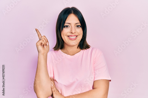Young hispanic woman wearing casual pink t shirt with a big smile on face, pointing with hand and finger to the side looking at the camera.