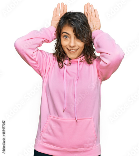 Young hispanic woman wearing casual sweatshirt doing bunny ears gesture with hands palms looking cynical and skeptical. easter rabbit concept.