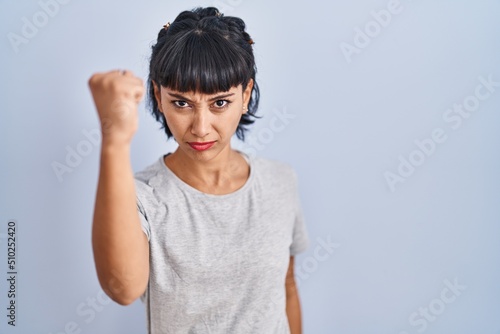 Young hispanic woman wearing casual t shirt over blue background angry and mad raising fist frustrated and furious while shouting with anger. rage and aggressive concept.