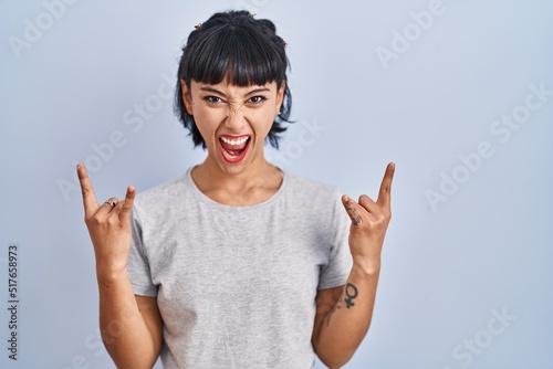 Young hispanic woman wearing casual t shirt over blue background shouting with crazy expression doing rock symbol with hands up. music star. heavy concept.