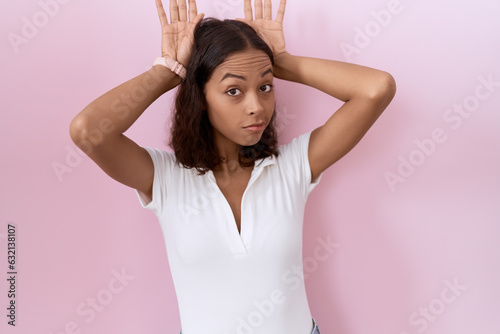 Young hispanic woman wearing casual white t shirt doing bunny ears gesture with hands palms looking cynical and skeptical. easter rabbit concept.