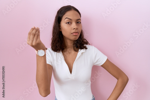 Young hispanic woman wearing casual white t shirt doing italian gesture with hand and fingers confident expression