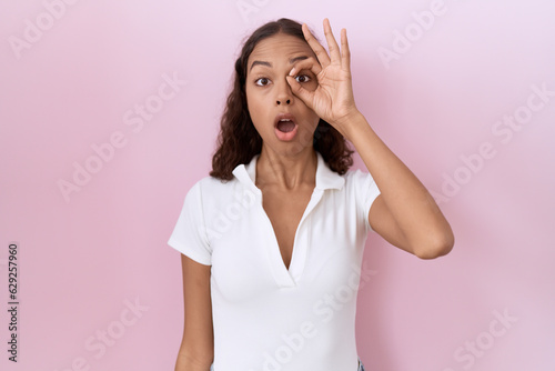Young hispanic woman wearing casual white t shirt doing ok gesture shocked with surprised face, eye looking through fingers. unbelieving expression.