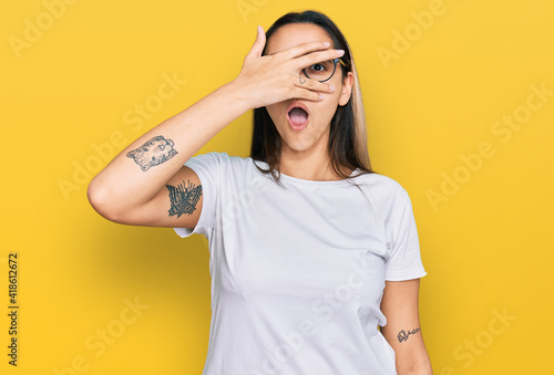 Young hispanic woman wearing casual white t shirt peeking in shock covering face and eyes with hand, looking through fingers with embarrassed expression.