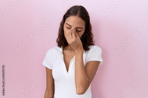 Young hispanic woman wearing casual white t shirt tired rubbing nose and eyes feeling fatigue and headache. stress and frustration concept.