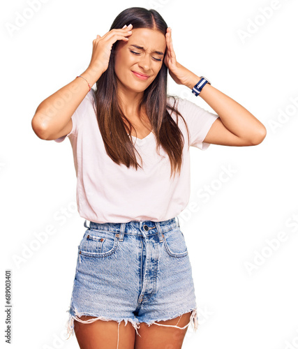Young hispanic woman wearing casual white tshirt with hand on head, headache because stress. suffering migraine.