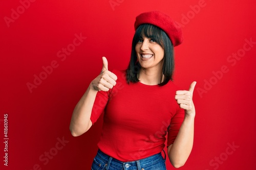 Young hispanic woman wearing french look with beret success sign doing positive gesture with hand, thumbs up smiling and happy. cheerful expression and winner gesture.