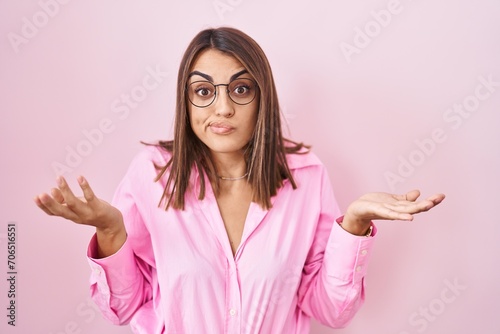 Young hispanic woman wearing glasses standing over pink background clueless and confused expression with arms and hands raised. doubt concept.