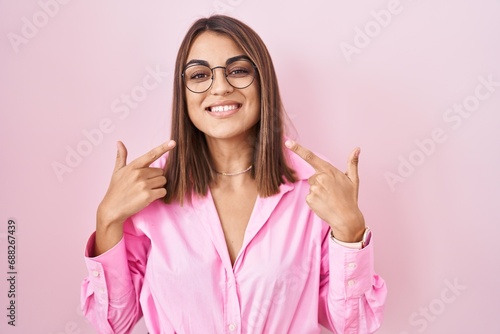 Young hispanic woman wearing glasses standing over pink background smiling cheerful showing and pointing with fingers teeth and mouth. dental health concept.